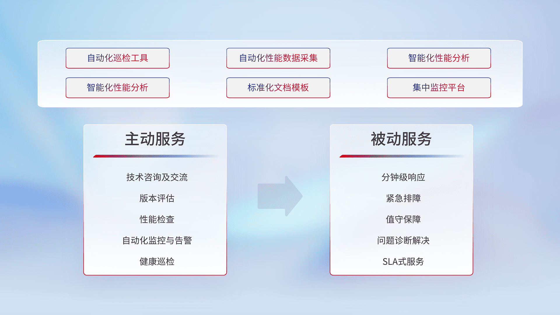 智能化工具和标准化文档,,保障服务质量,,,提供主动服务(包含技术咨询、、、、版本评估、、、、性能检查、、、自动化监控与告警、、健康巡检)和被动服务包含(分钟级响应、、、紧急排障、、值守保障、、问题诊断解决、、、SLA服务)。。