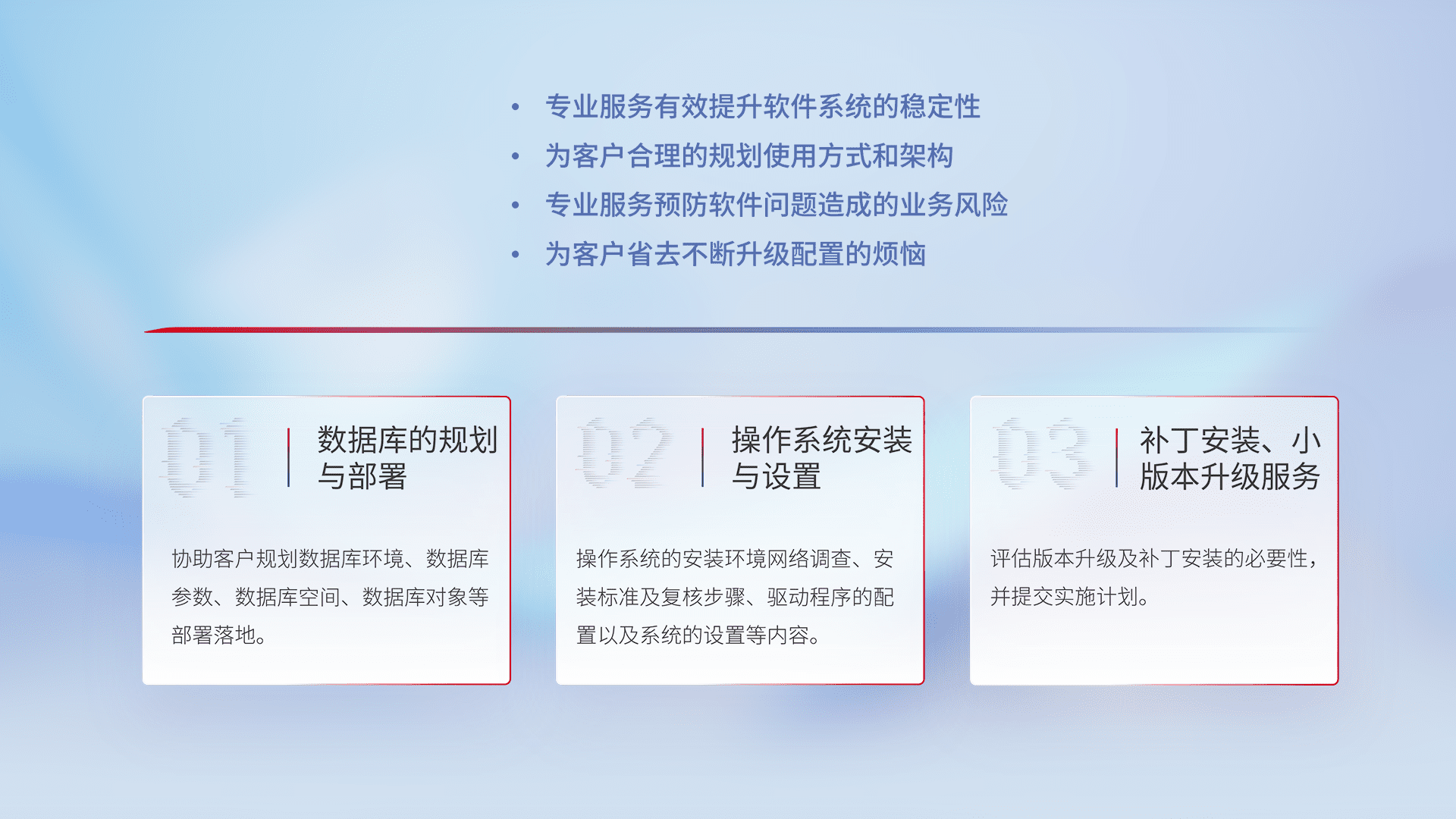 为客户提供软件规模升级、、快速部署、、、按需配置的专业服务,,,从数据库的规划与部署到操作系统的安装与设置,,,再到补丁安装和小版本升级提供支持。。。。